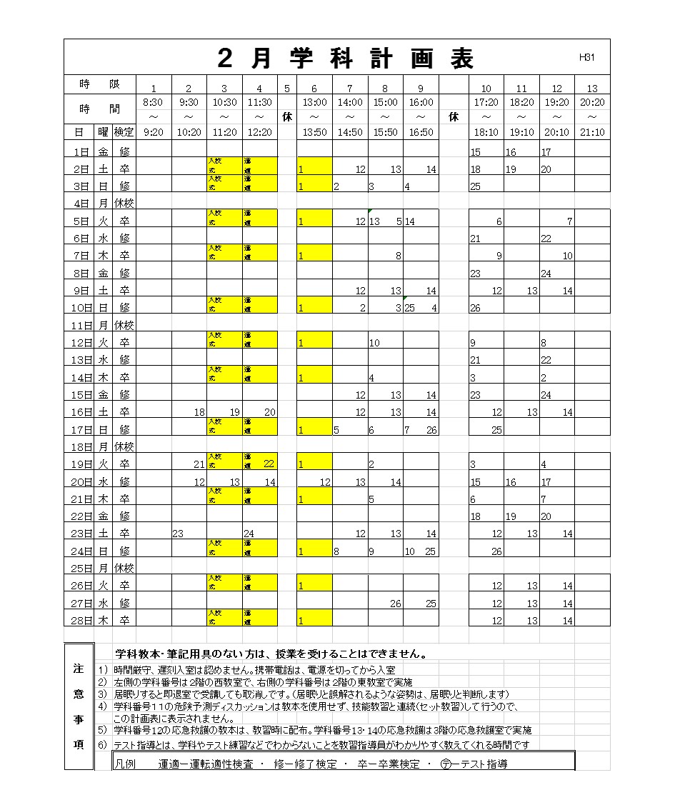 2月の学科計画表です。黄色の部分が入校日です。