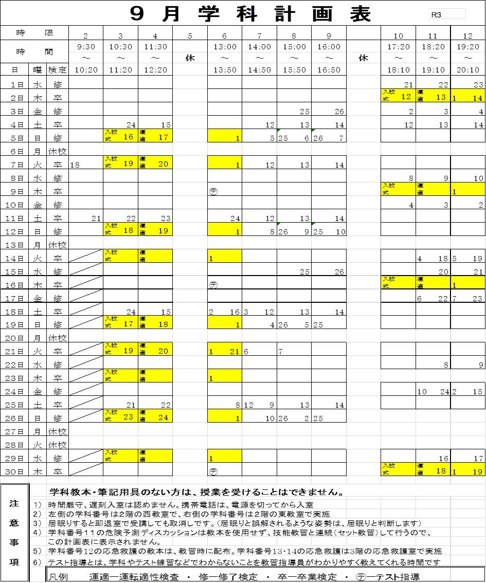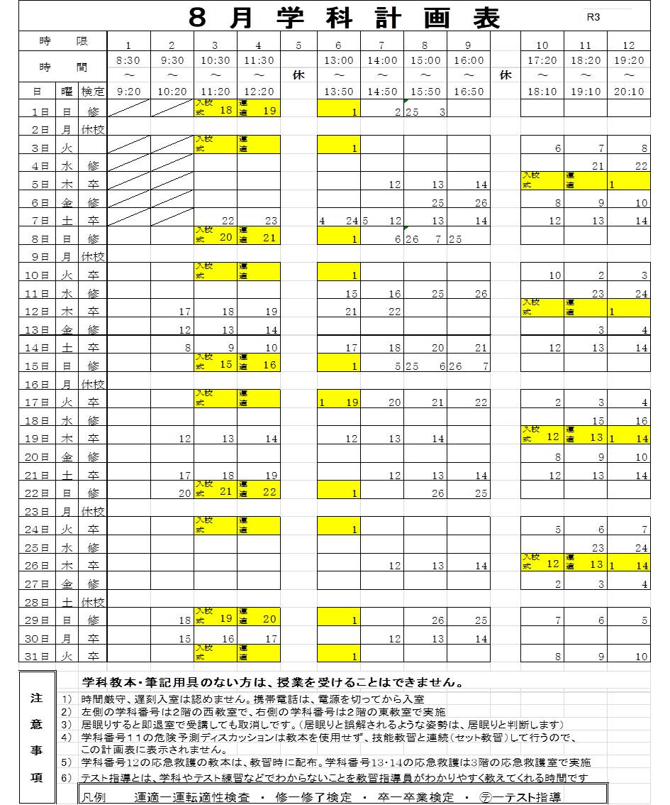 8,9月の学科計画表です。