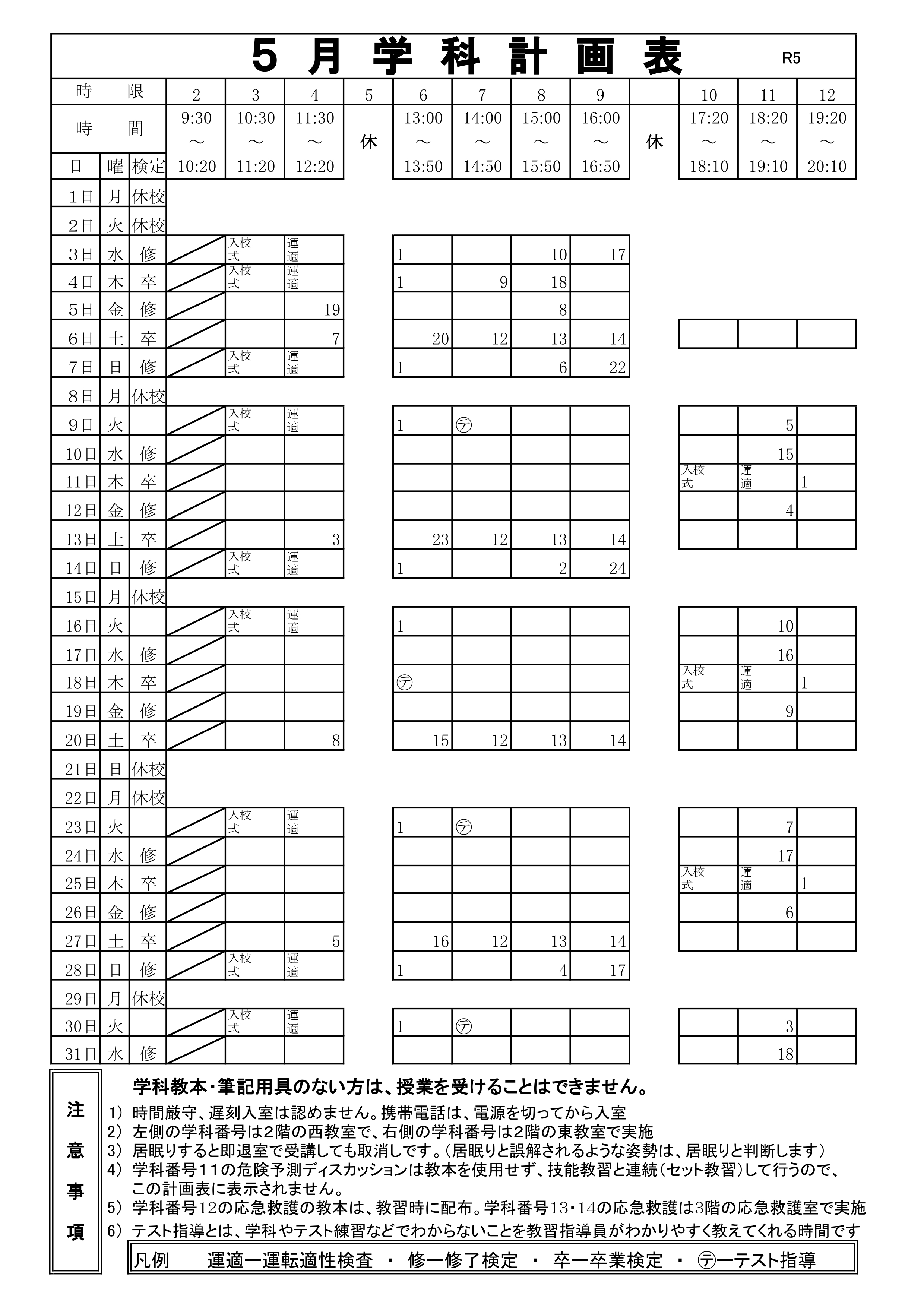5月の学科計画表です。