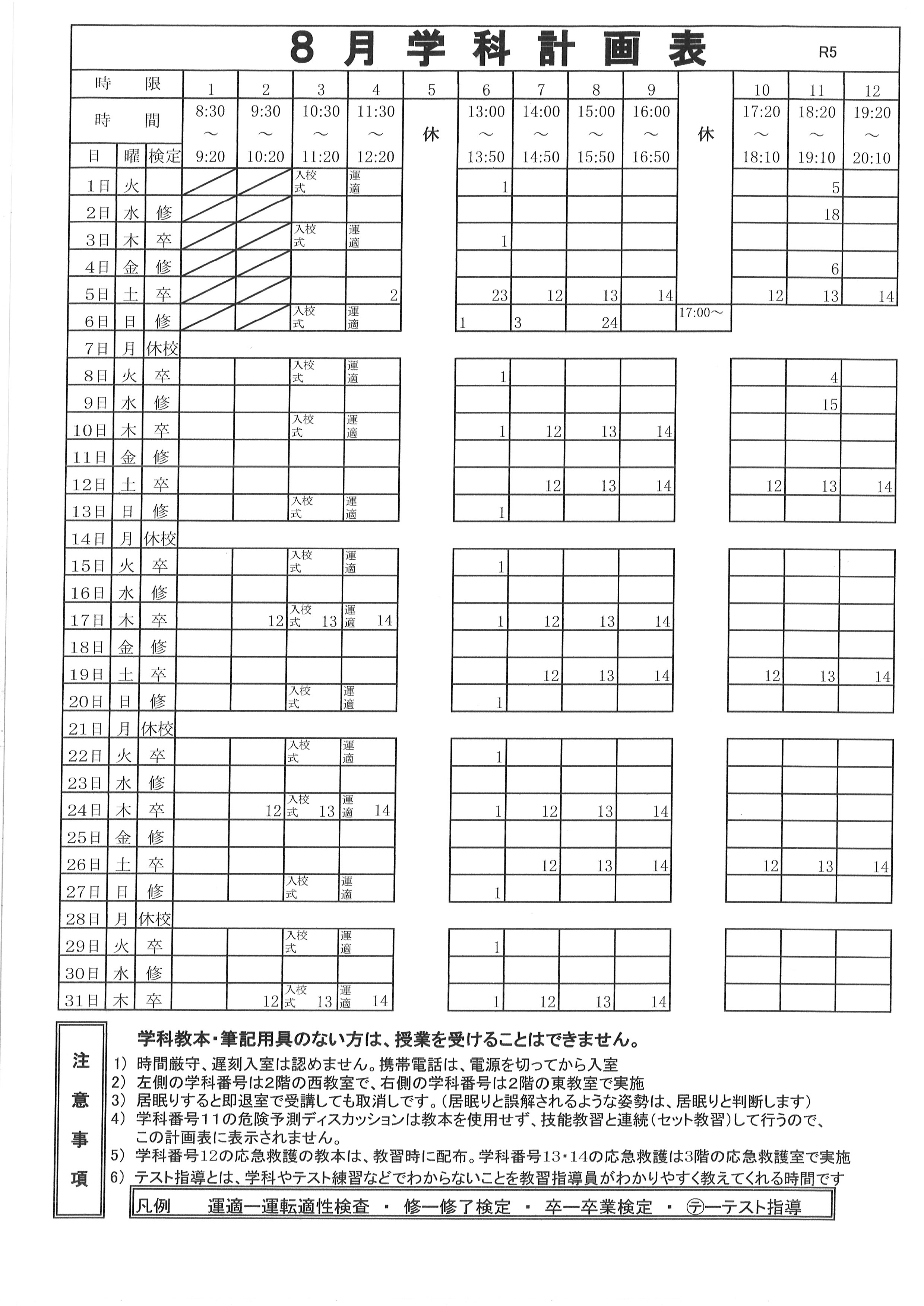 火曜日、木曜日、日曜日の入校日は10:00くらいまでにお越しください。
