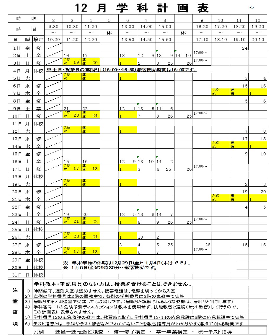 12月の学科計画表です。