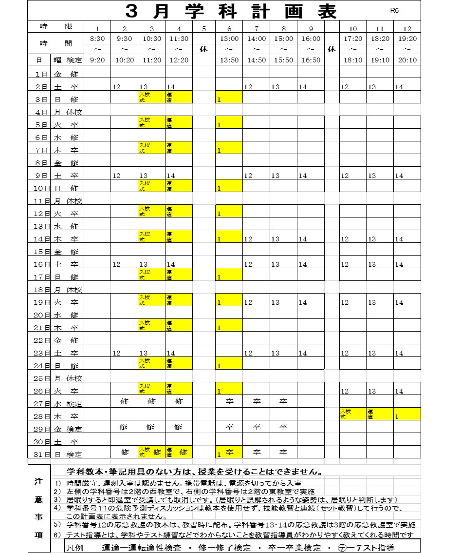 3月の学科計画表です。