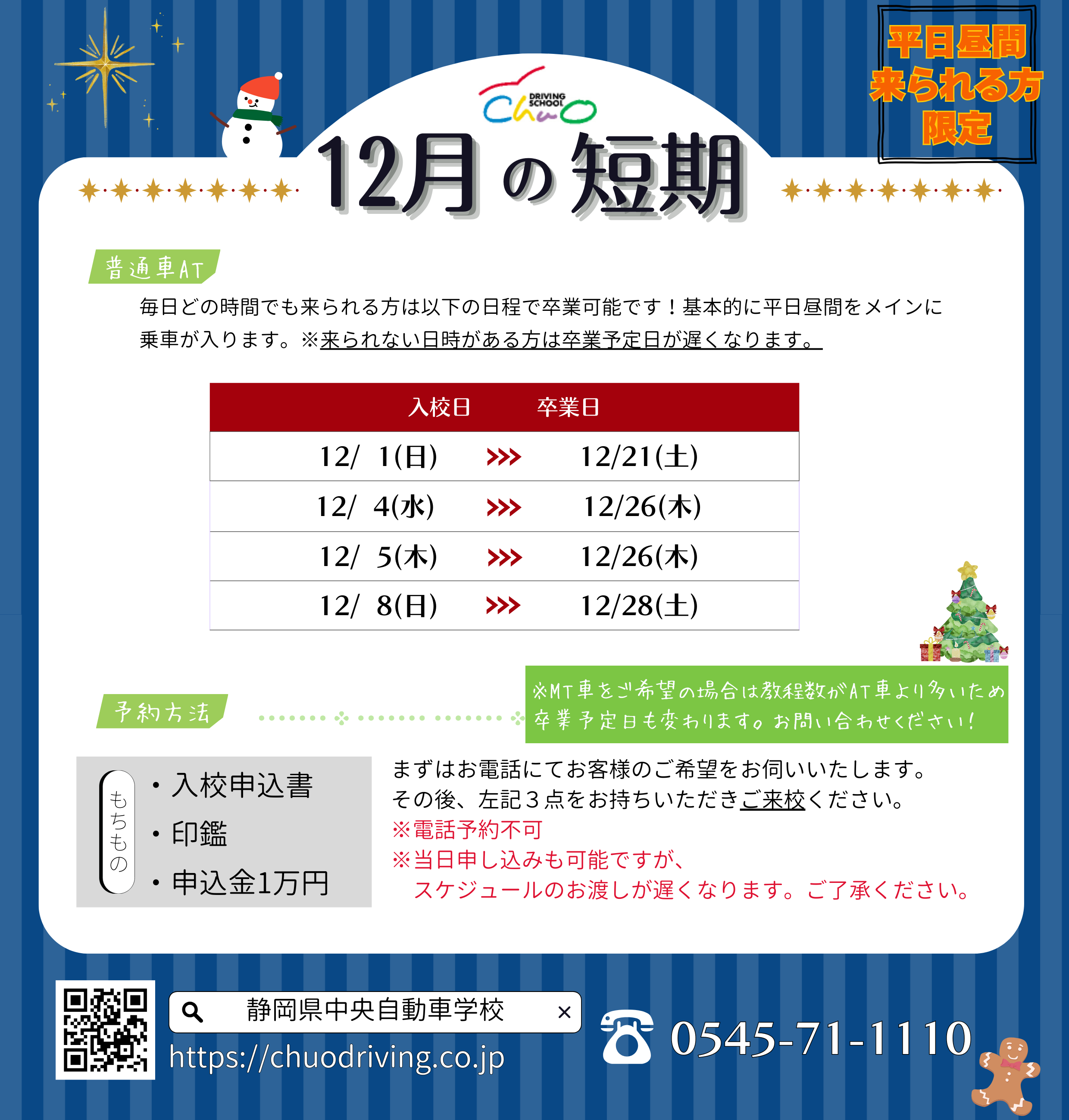 ※以下日程はAT車限定です。MT車をご希望の場合は教程数がAT車より多いため卒業は遅くなります。