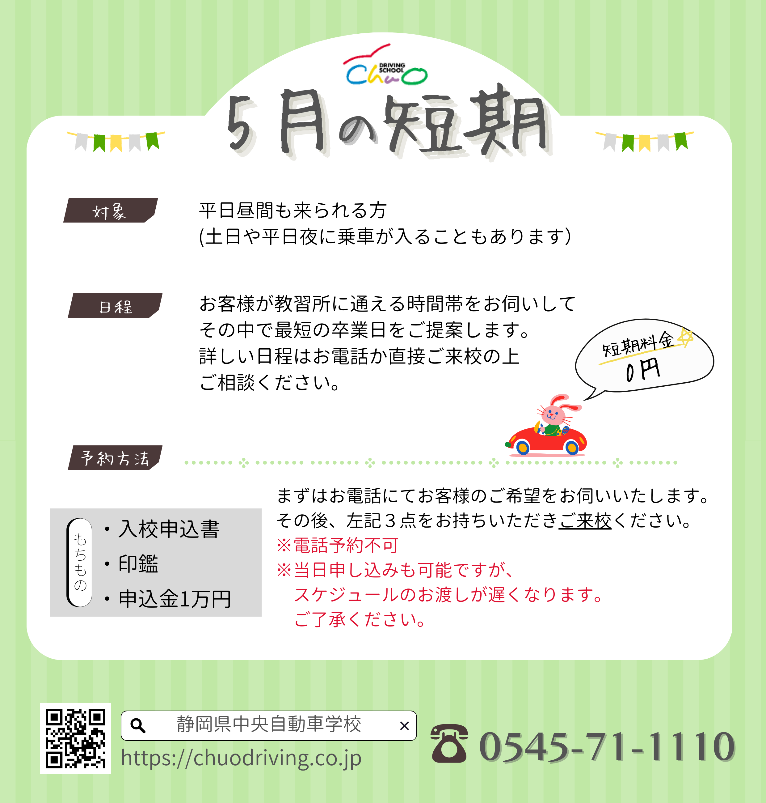 5月の短期 2025年4月27日 chuo_kanri 5月の短期です。 こちらは毎日どの時間でも来られる方で、主に平日昼間に乗車が入ります。 人数制限がございますのでご希望の方はお早めにお問い合わせください。 ※来られない日時ができたり、試験に不合格になると卒業は遅くなります