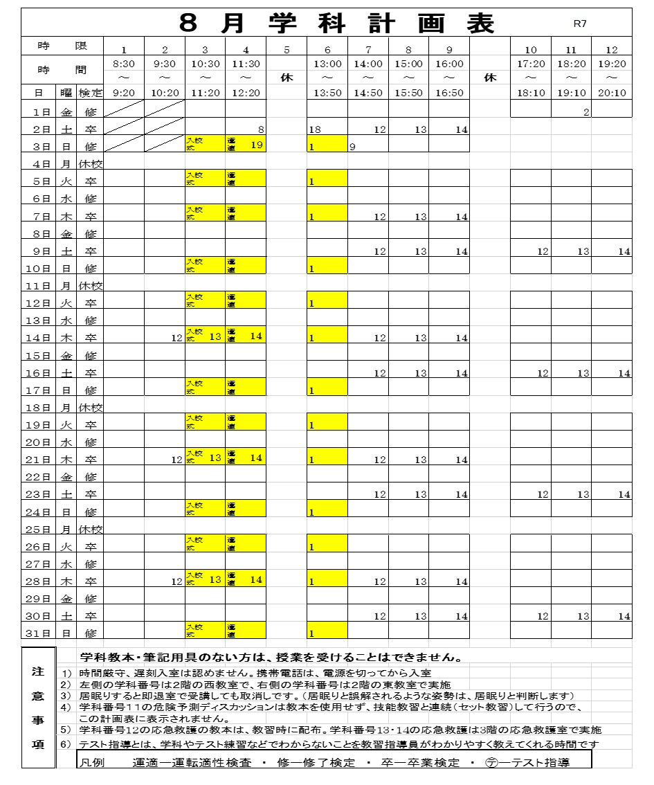 8月の学科計画表 2025年7月29日2025年8月29日 chuo_kanri 8月の学科計画表です。 入校される方は最初に入校説明、運転適性検査、学科1を受けていただきます。 入校ご希望の方は入校説明の前に視力検査、写真撮影を行わせて頂きます。 入校日は10:00くらいにはお越しください 持ち物:住民票(本籍入り) 身分証明証(マイナンバーカード、保険証など 学生証は不可) 教習料金、眼鏡・コンタクト(必要な方)、カラーコンタクトの方は写真撮影の際外していただきます ご不明な点がこざいましたらお気軽にお問い合わせください。