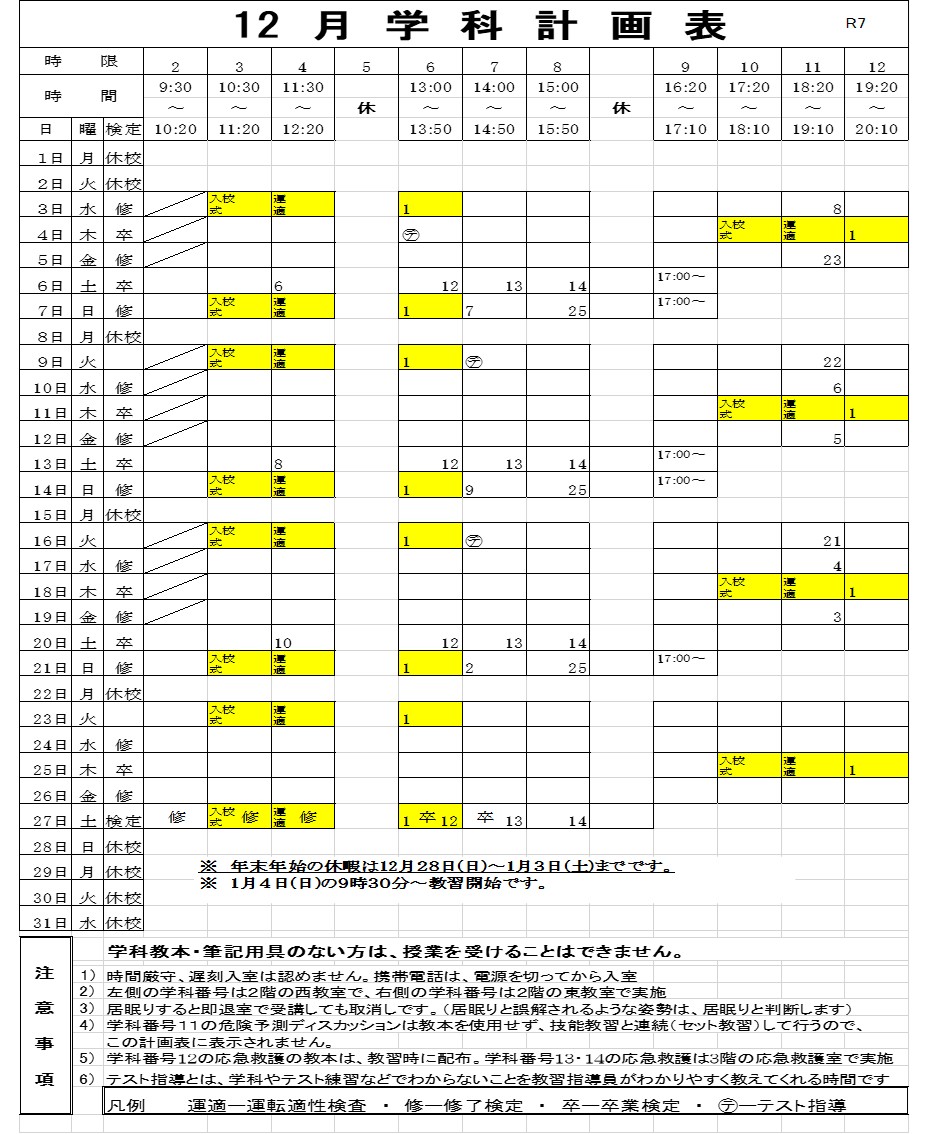 12月の学科計画表です。